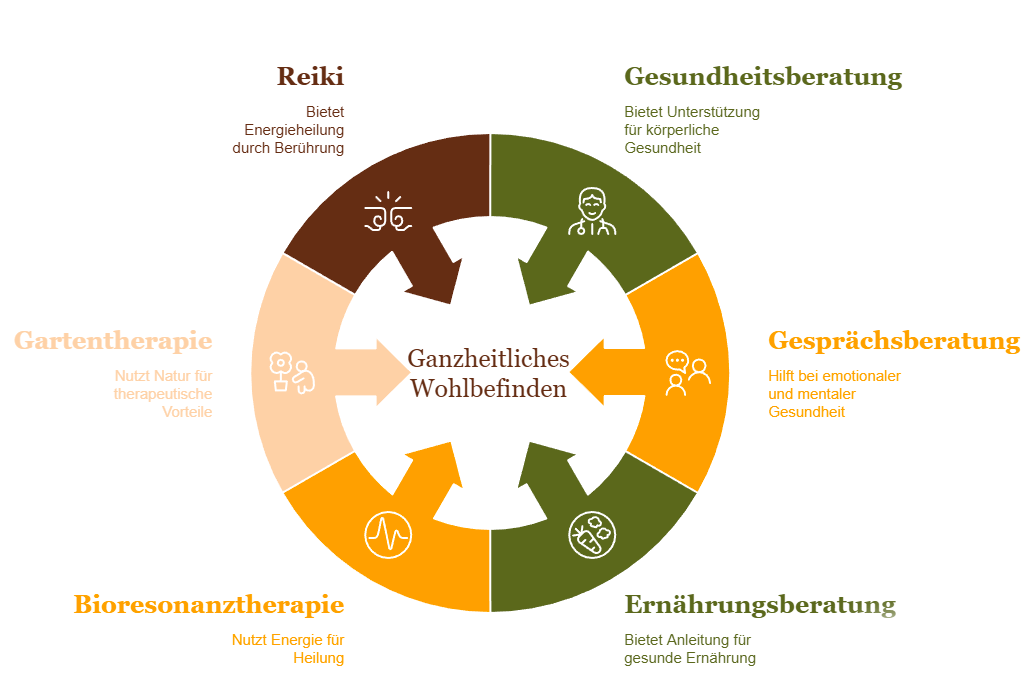Meine Vision ist es, Menschen ganzheitlich und achtsam auf ihrem individuellen Weg zu begleiten. Mit Angeboten wie Gesundheits- und Gesprächsberatung, Ernährungsberatung, Bioresonanztherapie, Gartentherapie und Reiki schaffen wir Räume für Verständnis, Orientierung und innere Balance.